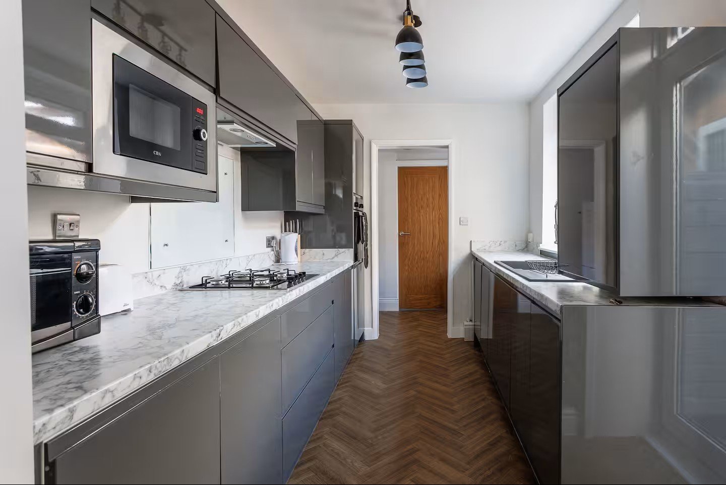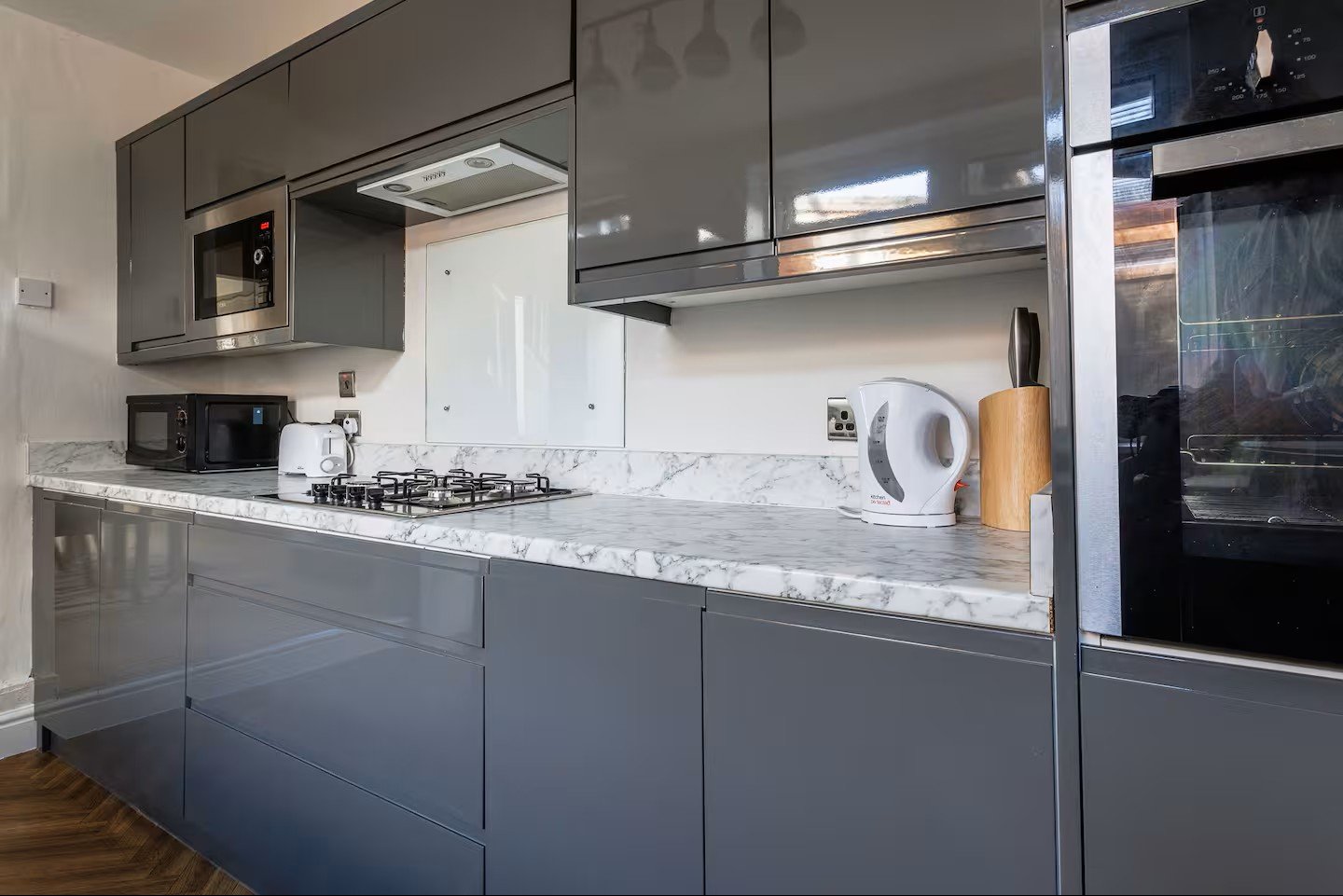 Enjoy a fully equipped kitchen with oven, hob, microwave, fridge-freezer, kettle, toaster, and all essential cookware. The dining table seats your group comfortably for shared meals.